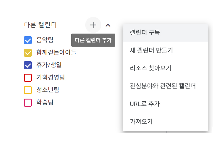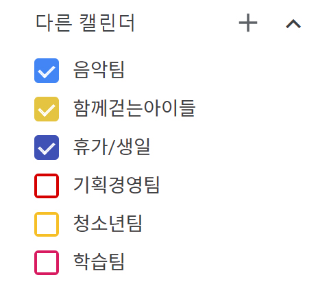 저는 함께걷는아이들 캘린더와 음악팀 캘린더를 기본으로 설정해두고,