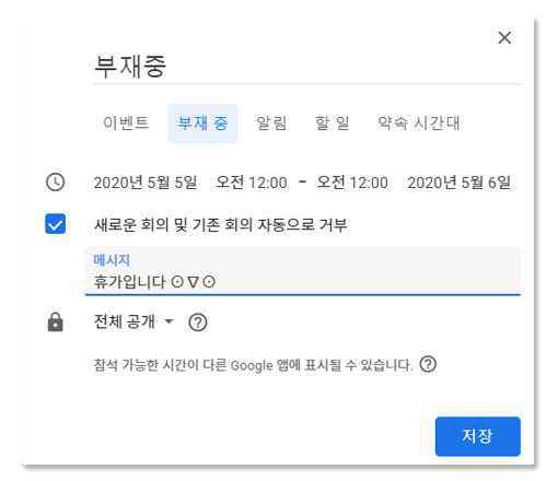 나의 캘린더에서 새로운 일정을 추가하고, [이벤트]를 [부재중]으로 변경한 뒤 전체 공개로 등록합니다.