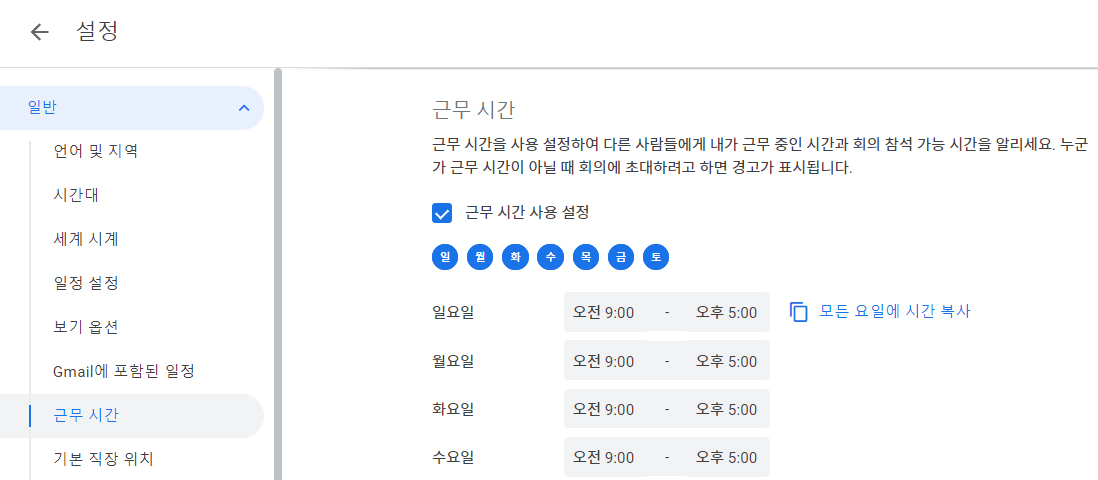 캘린더 우측 상단 톱니바퀴 > 설정 > 근무시간에서 근무 시간을 설정할 수 있습니다.