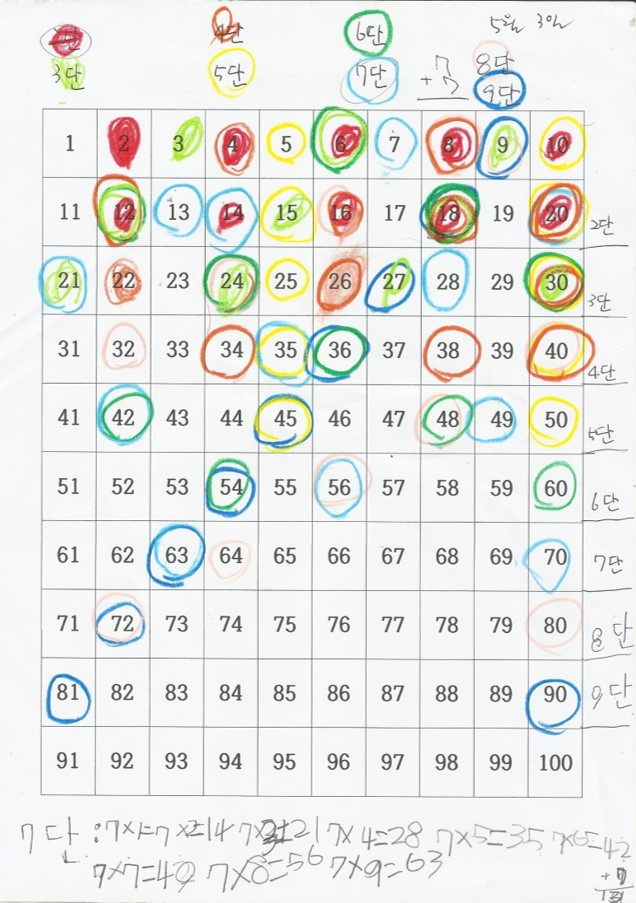 구구단의 원리를 이해할 수 있도록 학습과정을 여러 차시에 나누어 활동과 병행하며 지도하였다. 수의 규칙과 덧셈과 곱셈이 연결되는 원리를 아이가 깨우치고 나니 구구단을 쉽게 받아들이게 되었고 수학에 자신감이 붙어, 이전에 자주 틀리곤 했던 받아올림이 있는 세자리 수 덧세도 자신감 있게 하게 되었다. 아이와의 학습에서 계속 막혔던 부분(곱셈)을 고민하여 아이에게 맞는 방법이 무엇일지 고민해보고 여러방법을 시도해보면서 한계를 깨고 효과를 본 것 같아 교사로서 뿌듯한 마음이 크다. 구구단을 무조건 외우게 하는 것은 좋은 방법이 아니다. 아이가 원리를 알 수 있도록 끊임없이 방법을 찾고 반복적으로 학습할 수 있도록 하는 것이 중요하다. 학습하는 과정에서도 구구단을 아이가 어느정도 안다고 해서 그만두는 것이 아니라 매 수업시간 마다 반복하면서 알고 있는 지 확인하고 완전히 알 수 있는 경지가 되도록 교사가 체크하는 것이 중요하다. |
