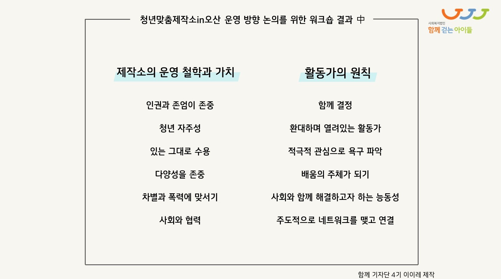 ‘청년을 중심으로 전체가 함께 움직이는 시스템’이라는 말씀이 제작소의 운영 방식뿐 아니라 지향하는 가치 또한 보여주고 있는 것 같아요. 지금까지는 사업에 대해 여쭤봤다면 이젠 활동가분들 개인의 생각과 경험을 더 들어보고 싶어요. 제게 주신 제작소 워크숍 결과지를 보면 제작소의 운영 철학과 가치, 활동가의 원칙 등이 정리되어 있는데요, 이 중에 활동가분들께서 가장 중요하게 생각하시는 원칙이나 가치는 무엇인가요?