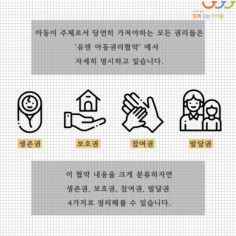 아동이 주체로서 당연히 가져야 하는 모든 권리들은 '유엔 아동권리협약'에서 자세히 명시하고 있습니다. 이 협약 내용을 크게 분류하자면 생존권, 보호권, 참여권, 발달권 4가지로 정리해볼 수 있습니다. 이 4가지 권리는 모두 중요하며 서로 연관되어 있는데요. 오늘 집중적으로 알아볼 주제는 바로 '참여권'입니다.