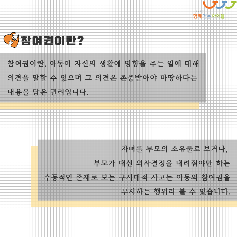 참여권이란, 아동이 자신의 생활에 영향을 주는 일에 대해 의견을 말할 수 있으며 그 의견은 존중받아야 마땅하다는 내용을 담은 권리입니다. 자녀를 부모의 소유물로 보거나, 부모가 대신 의사결정을 내려줘야만 하는 수동적인 존재로 보는 구시대적 사고는 아동의 참여권을 무시하는 행위라 볼 수 있습니다.