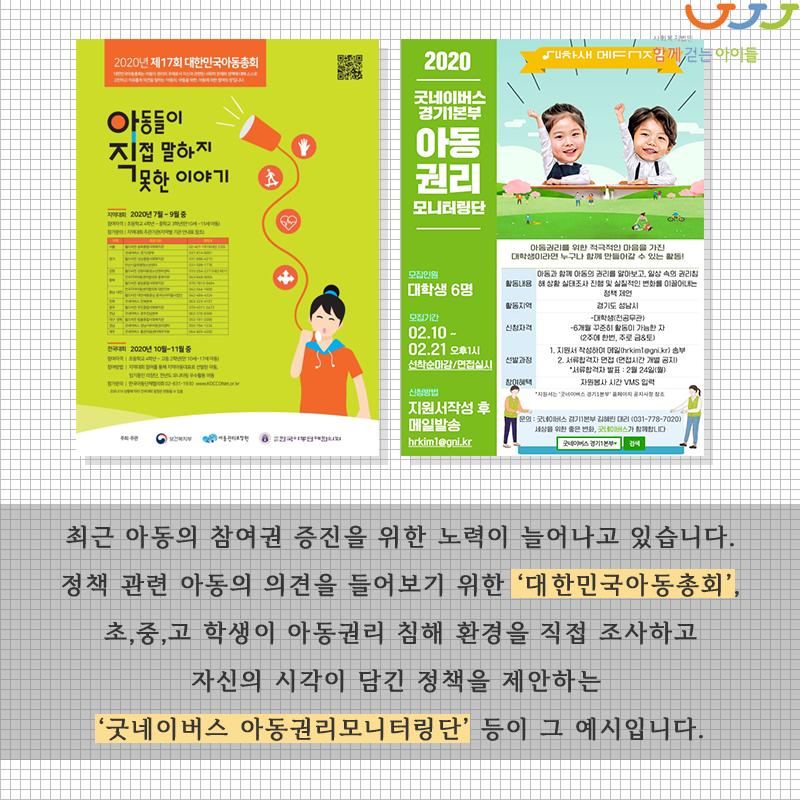 최근 아동의 참여권 증진을 위한 노력이 늘어나고 있습니다. 정책 관련 아동의 의견을 들어보기 위한 '대한민국아동총회', 초, 중, 고 학생이 아동권리 침해 환경을 직접 조사하고 자신의 시각이 담긴 정책을 제안하는 '굿네이버스 아동권리모니터링단' 등이 그 예시입니다.