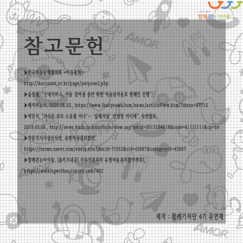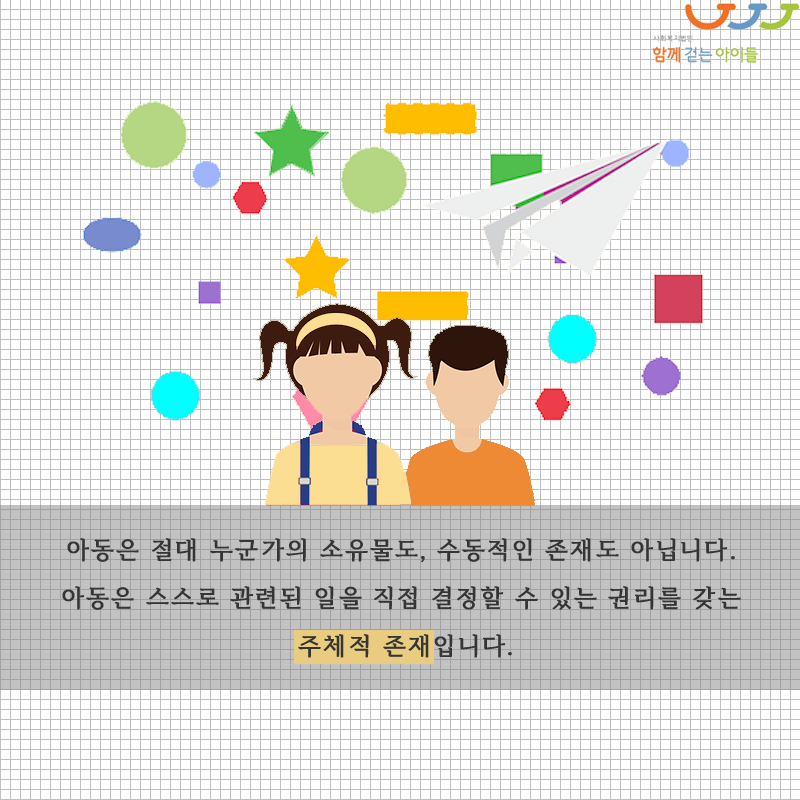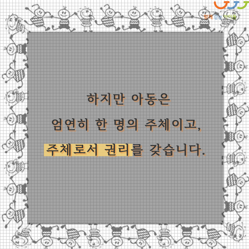 아동은 절대 누군가의 소유물도, 수동적인 존재도 아닙니다. 아동은 스스로 관련된 일을 직접 결정할 수 있는 권리를 갖는 주체적 존재입니다. 아동이 하나의 주체임을 자각하고 그들의 선택을 존중할 때, 아동이 진정으로 행복할 수 있는 사회가 되리라 믿습니다.