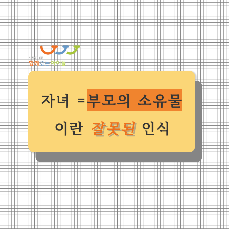 한국 여러 미디어에서 자주 다뤄지는 갈등이 있습니다. 자녀를 자기 마음대로 하려는 부모와 자녀 사이의 갈등이죠. 사랑한다는 명목 하에 자녀의 모든 것을 통제하고 강제하려 드는 이런 행위는, 자식을 부모의 소유물로 보는 사고방식의 일환이라 볼 수 있습니다. 하지만 아동은 엄연히 한 명의 주체이고, 주체로서 권리를 갖습니다.