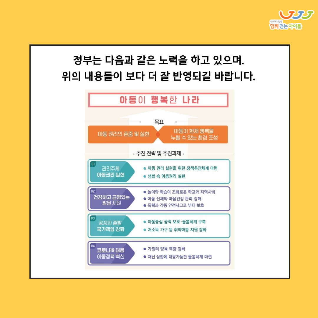 위 권고사항들을 고려하여 정부는 2020년 8월, 제2차 아동정책 기본계획안을 수립하였습니다. 정부는 다음과 같은 노력을 하고 있으며, 위의 내용들이 보다 더 잘 반영되길 바랍니다.
