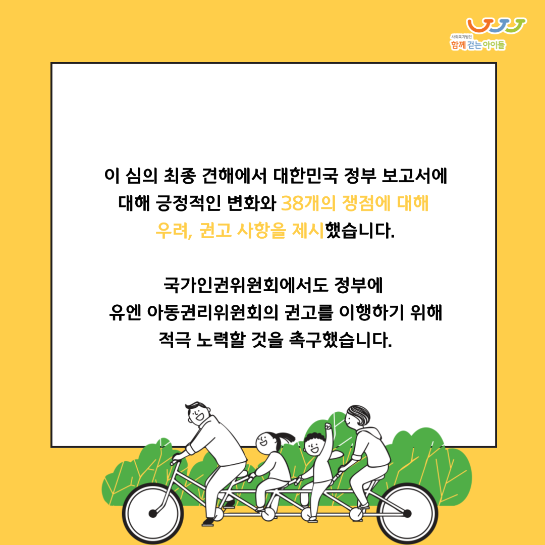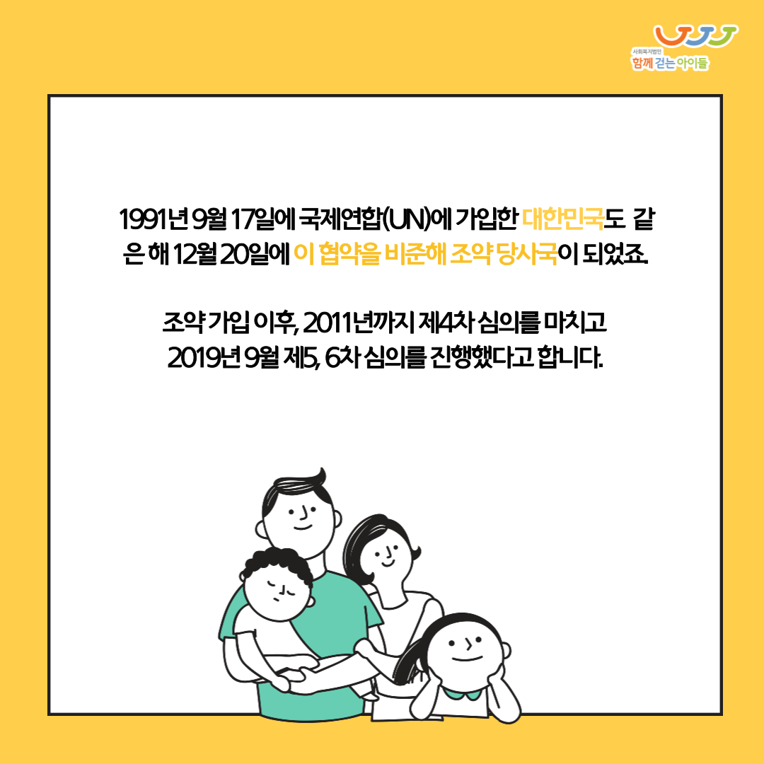 1991년 9월 17일에 국제연합(UN)에 가입한 대한민국도 같은 해 12월 20일에 이 협약을 비준해 조약 당사국이 되었죠. 조약 가입 이후, 2011년까지 제4차 심의를 마치고 2019년 9월 제5,6차 심의를 진행했다고 합니다. 이 심의 최종 견해에서 대한민국 정부 보고서에 대한 긍정적인 변화와 38개의 쟁점에 대해 우려, 권고 사항을 제시했습니다. 국가인권위원회에서도 정부에 유엔 아동권리위원회의 권고를 이행하기 위해 적극 노력할 것을 촉구했습니다.
