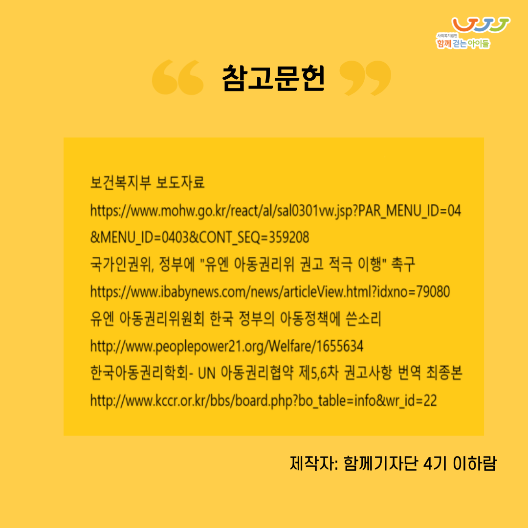 현재 우리나라에서는 유엔 아동권리위원회의 권고에 따라 아동의 권리를 보호해주려는 노력을 하고 있습니다. 하지만 아직 해결해야 할 문제들은 많이 남아있습니다. 모든 아이들이 웃을 수 있는 그날까지 꾸준한 노력이 필요할 것으로 보입니다. 아동은 보호 대상만이 아닌 권리의 주체입니다.