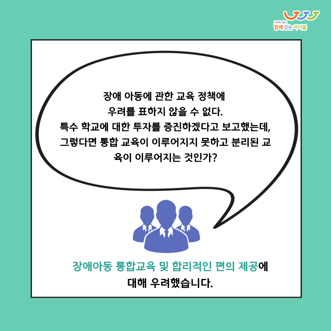 - 장애 아동에 관한 교육 정책에 우려를 표하지 않을 수 없다. 특수 학교에 대한 투자를 증진하겠다고 보고했는데, 그렇다면 통합 교육이 이루어지지 못하고 분리된 교육이 이루어지는 것인가?