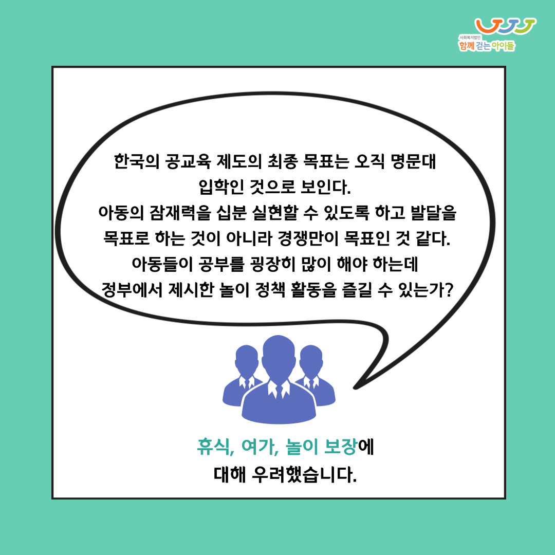 - 한국의 공교육 제도의 최종 목표는 오직 명문대 입학인 것으로 보인다. 아동의 잠재력을 십분 실현할 수 있도록 하고 발달을 목표로 하는 것이 아니라 경쟁만이 목표인 것 같다. 아동들이 공부를 굉장히 많이 해야 하는데 정부에서 제시한 놀이 정책 활동을 즐길 수 있는가?