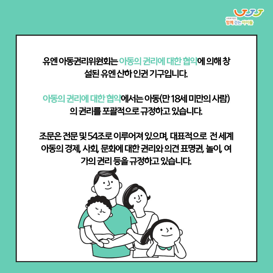 유엔 아동권리위원회는 아동의 권리에 대한 협약에 의해 창설된 유엔 산하 인권 기구입니다. 아동의 권리에 대한 협약에서는 아동(만 18세의 사람)의 권리를 포괄적으로 구성하고 있습니다. 조문은 전문 및 54조로 이루어져 있으며, 대표적으로 전 세계 아동의 경제, 사회, 문화에 대한 권리와 의견 표명권, 놀이, 여가의 권리 등을 규정하고 있습니다.
