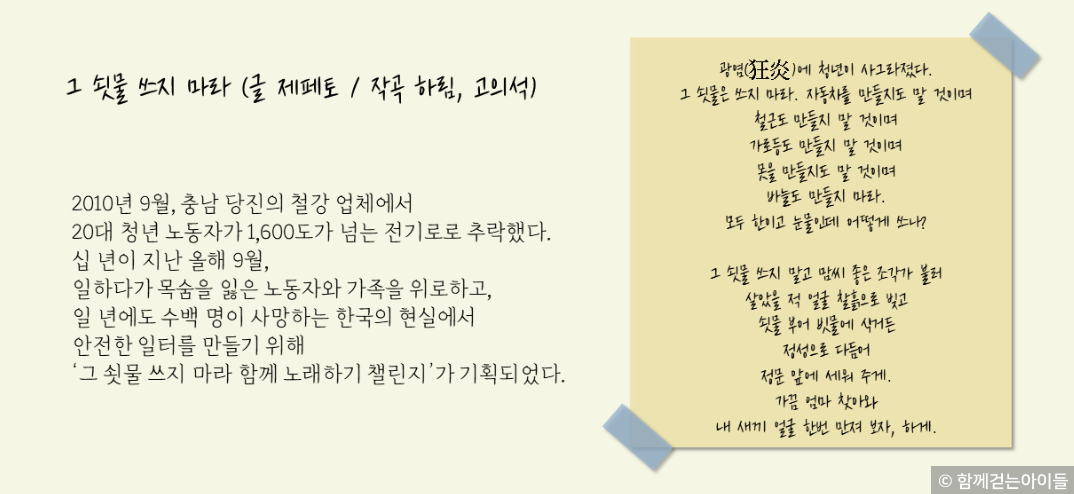 『알지 못하는 아이의 죽음』에서는 “우리가 먹고 마시고 이용하는 모든 일상 영역에 ‘알지 못하는 아이의 죽음’의 흔적이 남아 있다”(17쪽) 고 말한다. 김동준 군 이전과 이후에도 현장 실습생들의 노동 환경에는 늘 죽음이 도사리고 있었다.