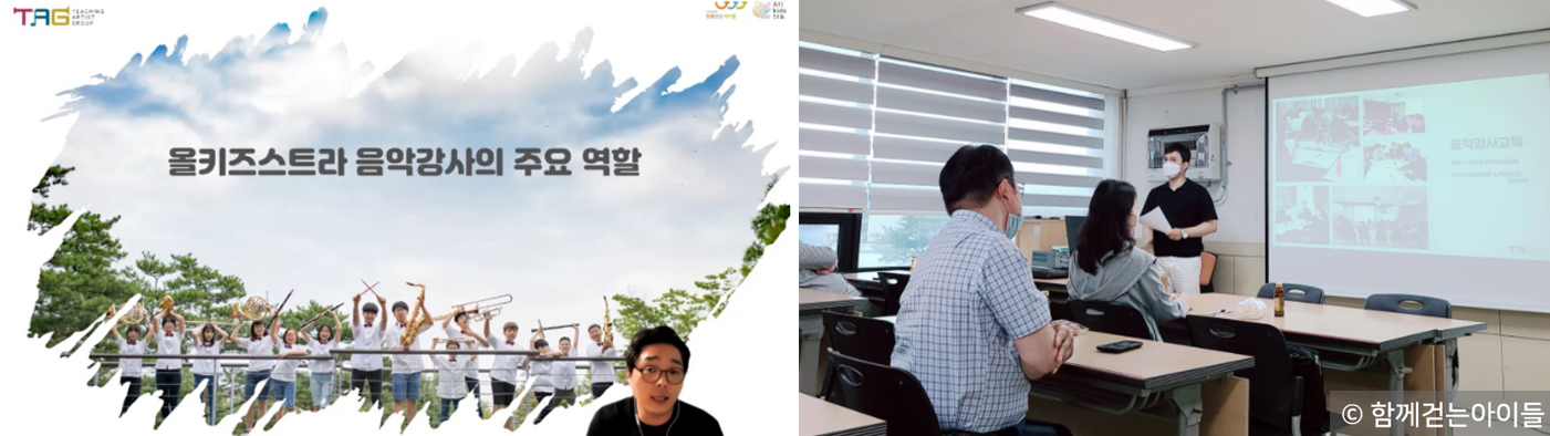 이번 교육에서 TAG는 함께걷는아이들과 올키즈스트라 사업을 설명하고 ‘올키즈스트라 음악강사의 역할’을 강의하였습니다. 악기를 잘 가르치는 것도 중요하지만, 어떤 태도와 마음으로 아이들을 이해하고 대해야 하는지 이야기를 나누었어요.
