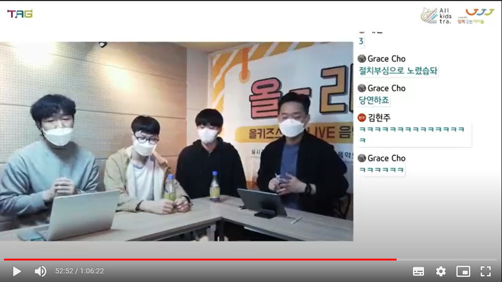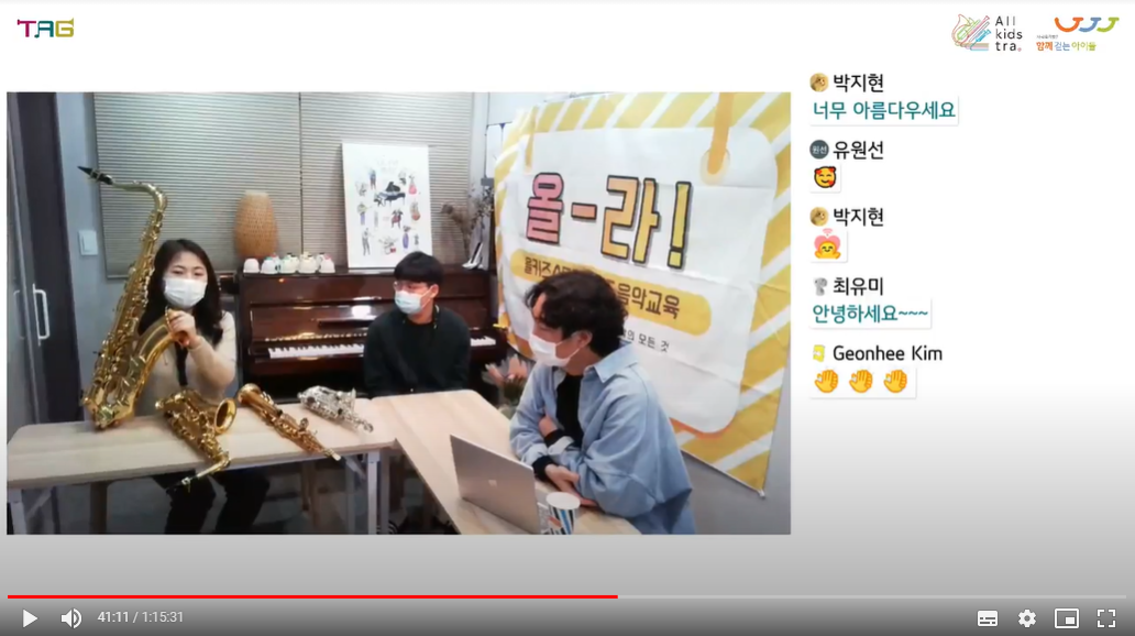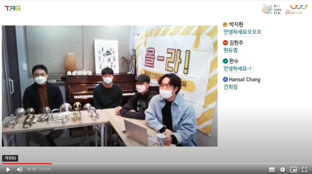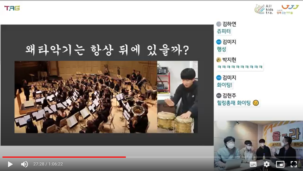 함께걷는아이들에서는 정기적으로 음악강사교육을 진행하는데, 작년에는 저희 TAG가 지역관악단 기본교육을 맡아서 강의할 기회가 생겼습니다. 지역의 신규/기존 강사들에게 함께걷는아이들의 미션과 비전을 소개하고 10년 가까이 지휘자와 파트 강사로 지내면서 경험했던 사례들을 전달했습니다. 또 작년 9월, ‘제5회 국제예술교육 실천가 대회(ITAC5) / TA 컨퍼런스’도 다녀왔습니다. 컨퍼런스에서 많은 예술가들의 활동 사례와 발표들을 접했어요. 다음에는 저희 TAG도 직접 발표할 수 있기를 기대하고 있습니다. 현재는 올키즈스트라 상위관악단을 대상으로 진행중인 온라인라이브교육 '올-라!' 방송을 두달에 한 번씩 기획, 진행하고 있습니다