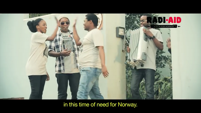 2012년 노르웨이의 교육단체 SAIH는‘ Africa for Norway’라는 이름의 영상을 제작했다. 영상 속 아프리카 사람들은 추위에 떠는 노르웨이 사람들을 도와주기 위해 라디에이터를 모금한다. 아프리카 사람들은 노르웨이를 위해 노래를 제작하고 추위에 빠진 노르웨이를 기부를 통해 구원할 수 있다고 주장한다.