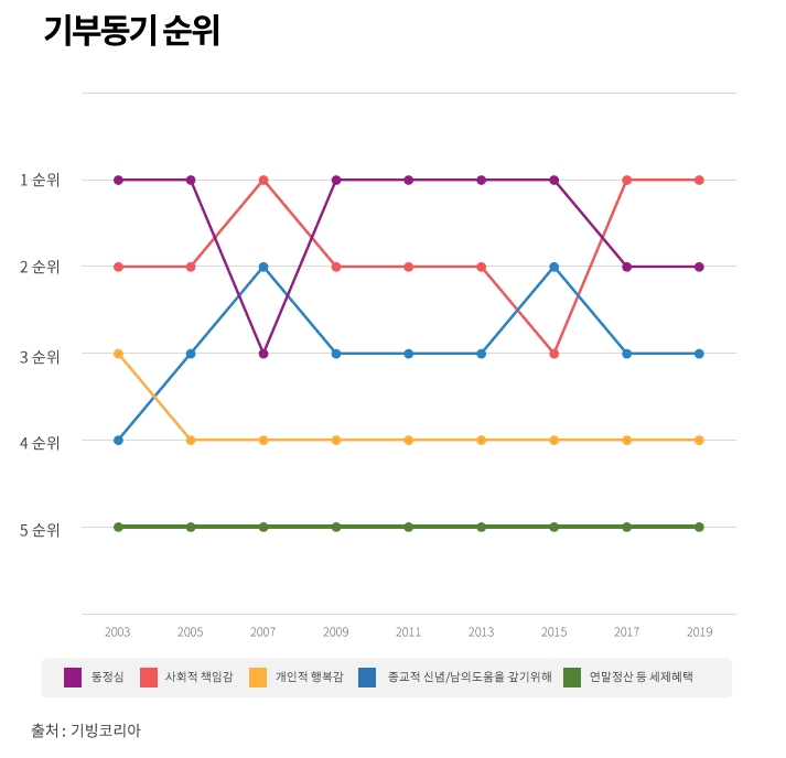 아름다운 재단의 기부문화 연구소에 따르면, 2019년 기준 우리나라 사람들이 기부하는 동기 중 가장 직접적인 이유로 ‘사회적 책임감’을 꼽았다. 그리고 2순위로는 ‘동정심’이 뽑혔다. 아직 우리 사회에서 기부는 ‘불쌍함’이 원천이 되는 경우가 매우 높다는 것이다. 똑같은 기부 대상자라 하더라도 더 안타까운 대상을 찾고, 각자의 어려움을 비교하는 풍토가 여전히 존재할 수 밖에 없는 것이다.