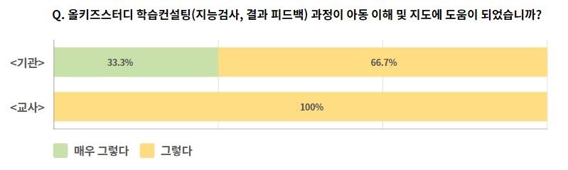 기관, 교사 모두 학습컨설팅 과정이 아동 이해 및 지도에 도움이 되었다고 응답해주었습니다.