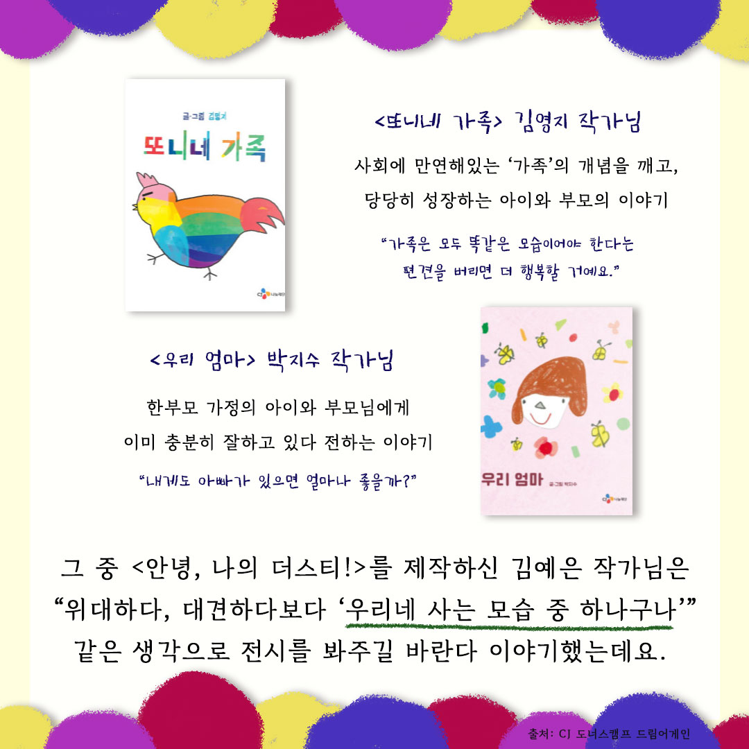 이번 <엄마의 꿈>에서 눈여겨 볼 부분은 CJ 도너스캠프 드림어게인 활동을 통해 신은하, 박예지 작가님을 비롯한 청소년 미혼모가 동화책을 제작하고, 전시까지 했다는 점입니다. 그림책에는 아이와 사회에 전달하고자 하는 메시지를 담았고 '엄마'가 아닌 '나'를 위한 시간들로 책을 만드는 과정을 꾸려갔다고 합니다.