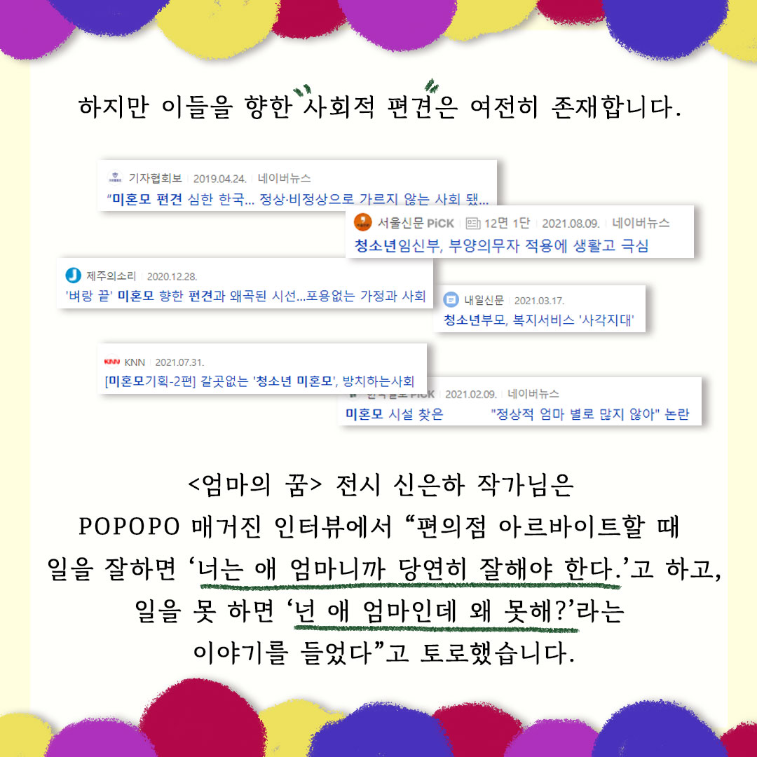 <엄마의 꿈>전시 신은하 작가님은 POPOPO 매거진 인터뷰에서 "편의점 아르바이트 할 때 일을 잘하면 '너는 애엄마니까 당연히 잘해야 한다.'고 하고, 일을 못 하면 '넌 애엄마인데 왜 못해?'라는 이야기를 들었다"고 토로했습니다.