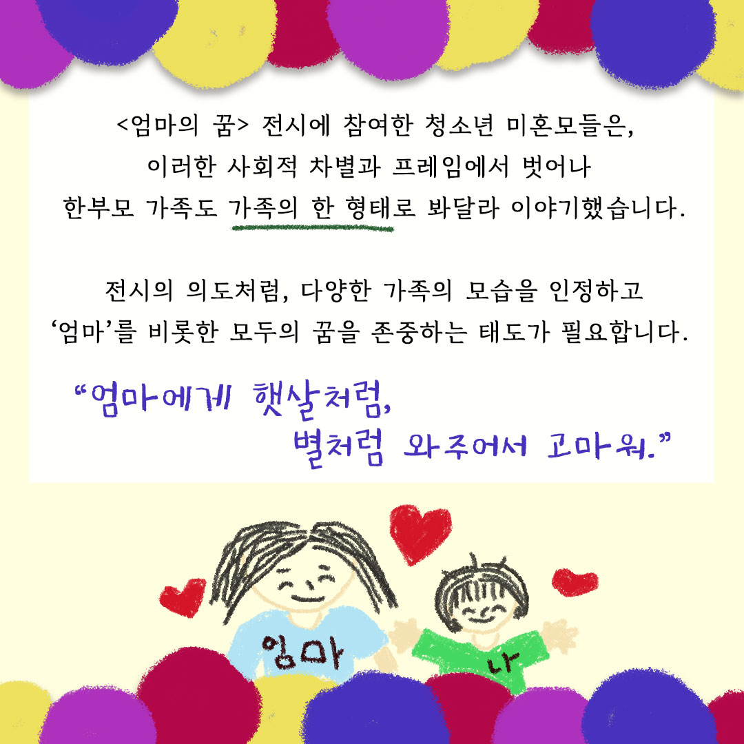 <엄마의 꿈>전시에 참여한 청소년 미혼모들은, 이러한 사회적 차별과 프레임에서 벗어나 한부모 가족도 가족의 한 형태로 봐달라 이야기했습니다. 전시의 의도처럼, 다양한 가족의 모습을 인정하고 '엄마'를 비롯한 모두의 꿈을 존중하는 태도가 필요합니다.