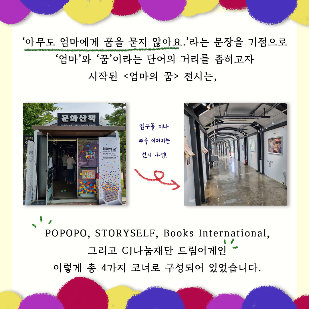 '아무도 엄마에게 꿈을 묻지 않아요.' 라는 문장을 기점으로 '엄마'와 '꿈'이라는 단어의 거리를 좁히고자 시작된 <엄마의 꿈> 전시는, POPOPO, STORYSELF, Books International, 그리고 CJ나눔재단 드림어게인 이렇게 총 4가지 코너로 구성되어 있었습니다.