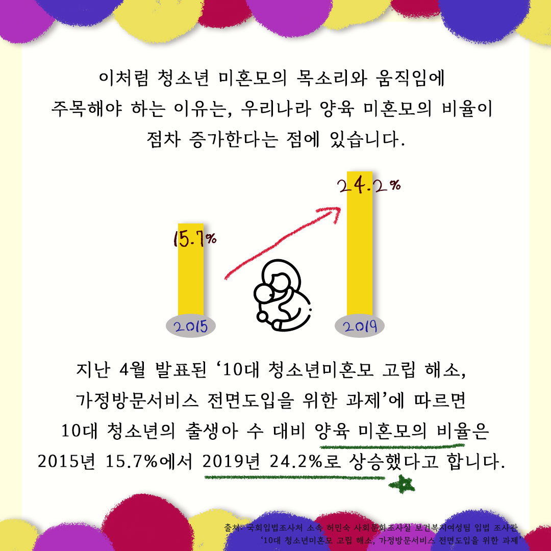 이처럼 청소년 미혼모의 목소리와 움직임에 주목해야 하는 이유는, 우리나라 양육 미혼모의 비율이 점차 증가한다는 점에 있습니다. 지난 4월 발표된 '10대 청소년 미혼모 고립 해소, 가정방문서비스 전면도입을 위한 과제'에 따르면 10대 청소년의 출생아수 대비 양육 미혼모의 비율은 2015년 15.7%에서 2019년 24.2%로 상승했다고 합니다.
