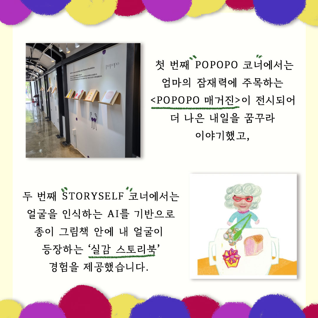 첫 번째 "POPOPO코너"에서는 엄마의 잠재력에 주목하는 <POPOPO 매거진>이 전시되어 더 나은 내일을 꿈꾸라 이야기했고, 두 번째 "STORYSELF 코너"에서는 얼굴을 인식하는 AI를 기반으로 종이 그림책 안에 내 얼굴이 등장하는 '실감 스토리북' 경험을 제공했습니다.