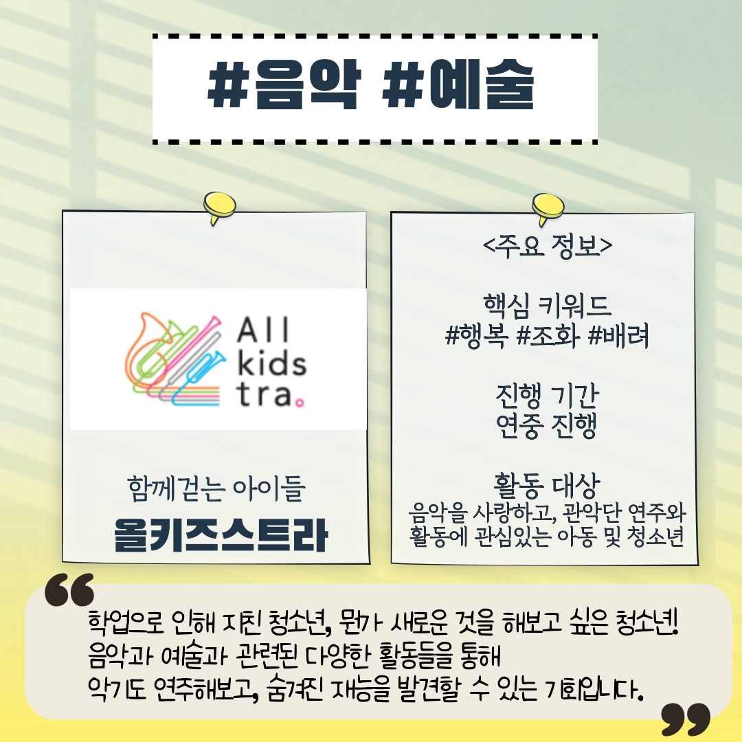 음악과 예술과 관련된 다양한 활동들을 통해 악기도 연주해보고, 숨겨진 재능을 발견할 수 있는 기회입니다"
