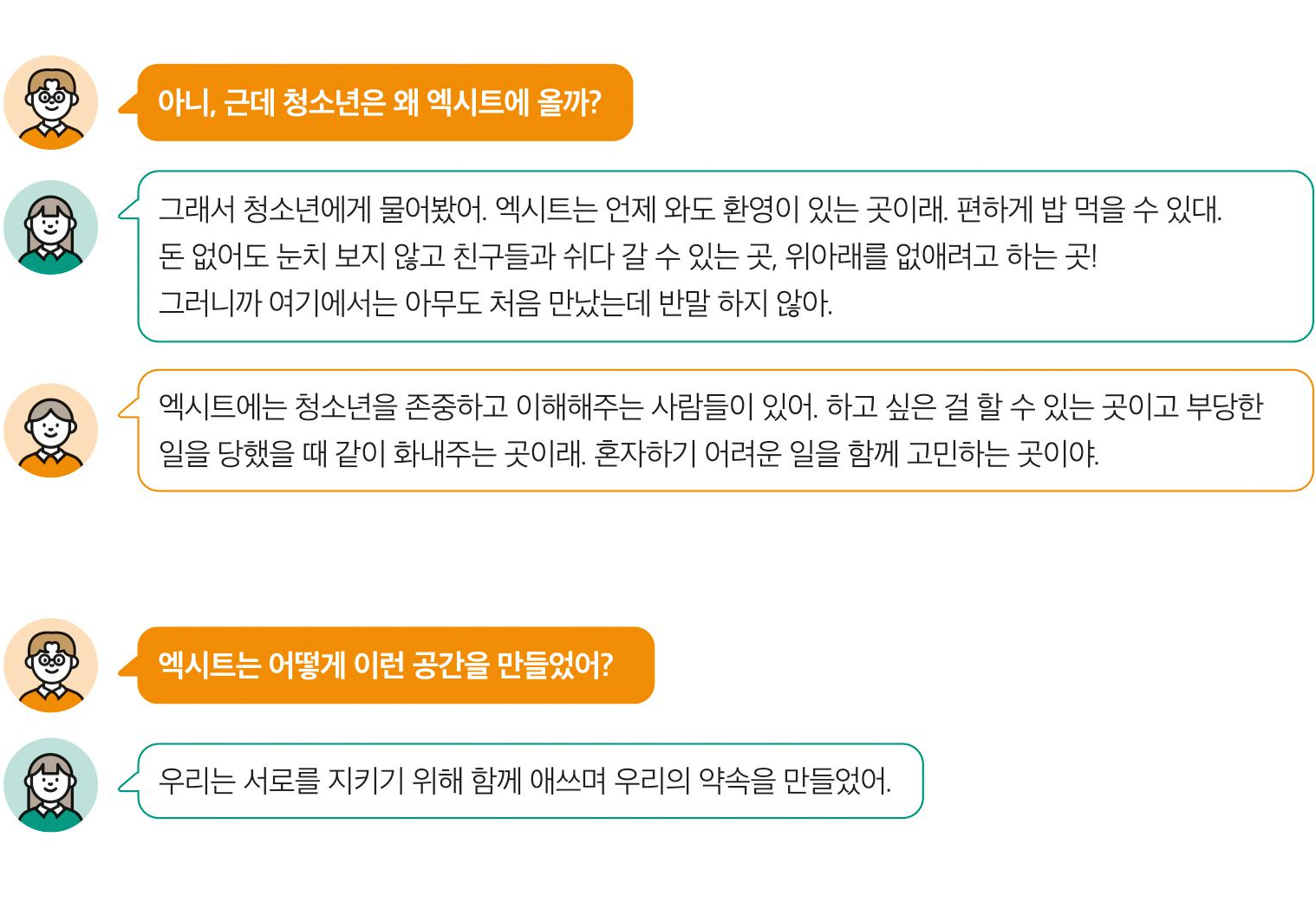 2011년 7월부터 지금까지 움직이는청소년센터 EXIT(이하 엑시트)는 비가 오나 눈이 오나 설이나 추석이나 저녁 8시부터 새벽 1시까지 태풍에도 코로나에도 거리에 있는 청소년을 만나왔습니다.
