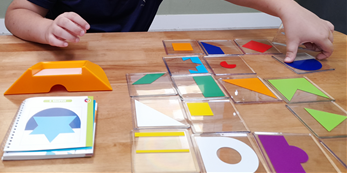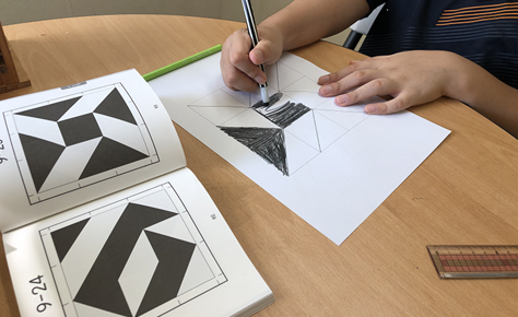 | 1 | 동기유발 | ![]() <평면자료를 보고 똑같이 색칠해보기> - 본격적인 교구 활동에 들어가기 전에 학생이 도안을 보고 따라 색칠해보게 함으로써 주의력을 높이도록 하였다. - 사선을 그려야 하는 곳은 연필과 자를 이용하여 그렸다. 1~3차시 각각 다른 평면 자료를 활용하여 색칠하였다. - IQ두뇌퍼즐 평면자료를 보고 똑같이 색칠하는 활동지를 보더니, 사선을 그어야 한다는 것을 스스로 인지하고 그었다. *사선 그리기를 힘들어하는 경우, 교사가 설명하면서 같이 그려주도록 한다. |