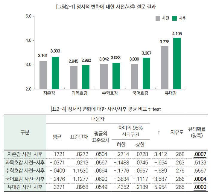 자존감과 국어과목에 대한 호감, 유대감 3개의 변수가 사후에 향상을 보였고