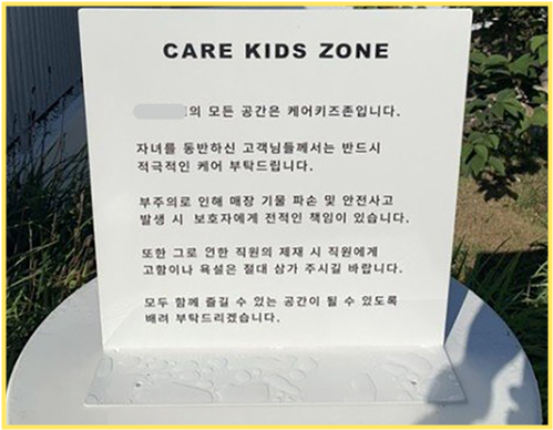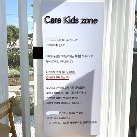 최근 한 커뮤니티 사이트에 “노 키즈 존”대신 생겨난 “케어 키즈 존”이라는 제목으로 “케어 키즈 존”을 시행하는 한 카페의 안내판 사진이 올라왔다. 안내판에는 이 카페가 노 키즈 존이 아닌 케어 키즈 존이며, 아이를 동반한 고객들을 향해 자녀의 적극적 케어를 요구하는 내용을 담고 있었다.