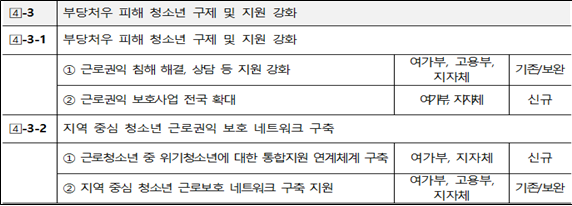 지난 2019년, 한국청소년정책연구원은 보고서 <청소년 근로 환경개선을 위한 지원방안 연구>를 발표했다. 보고서에는 아래와 같이 청소년 노동자가 겪는 문제와 이에 대한 정책 제언을 담고 있다.