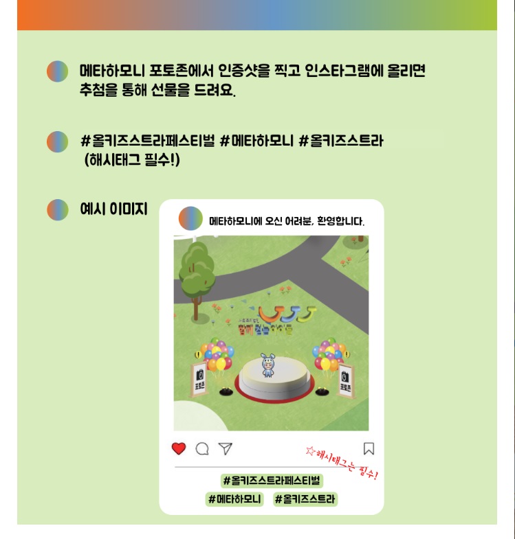 메타하모니 포토존에서 인증샷을 찍고 인스타그램 게시글에 사진을 올리면, 추첨을 통해 선물을 받을 수 있다. 게시글에는 인증사진과 해시태그가 필수! 인증샷이 가능한 공간은 ‘관악단 부스’와 ‘광장’이니 잘 기억해두자.