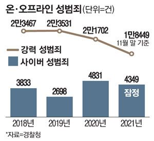 주목할 지점은 성폭력 피해자의 연령은 지속적으로 낮아지고 있다는 부분이다. 2016년 23.6%를 차지했던 13살 미만의 피해자는 2019년 30.8%로 3년 연속 증가 추세를 보였다. 특히 성착취물 제작 및 통신매체이용음란죄 등 디지털 성범죄는 13∼15살에서 가장 많이 발생했다.