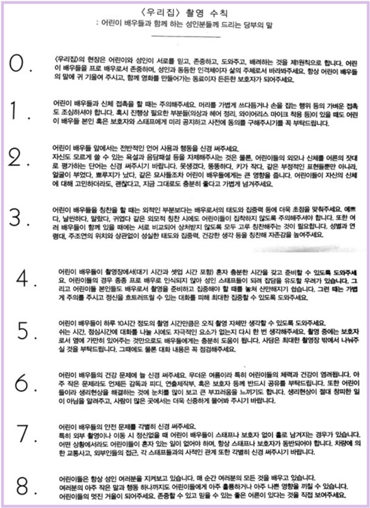 위 사진 자료는 2019년 개봉한 “우리집”이라는 영화의 촬영 수칙이다. 한 문장씩 읽어보면 어린이 배우들을 어린이로서, 동시에 한 영화의 배역을 맡은 배우로서 존중하고 배려한 내용들이다. 모든 촬영장이 위에 제시한 “우리집의 경우처럼 어린이를 존중하는 촬영 수칙을 세우는 등 어린이들을 충분히 이해하고 배려한다면, 얼마나 좋을까? 하지만, 안타깝게도 아직 한국 공연예술계의 촬영장에서는 아역배우들을 위한 촬영 현장을 제대로 만들지 못하고 있다.