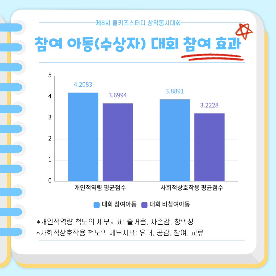 분석 결과, 모든 영역에서 대회참여아동의 점수가 더 높아