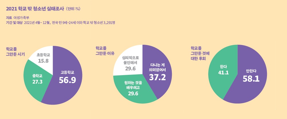 매년 학교를 그만두는 청소년의 수는 약 3만 명에서 5만 명 정도인 것으로 집계되고 있다. 그 이유나 유형은 다양하고, 유학이나 입시 준비를 위해서 그만두는 경우까지 있기에 일률적으로 이야기하기는 어렵다. 하지만 그중에 현재 학교 교육의 문제점으로 인해 학교를 그만두는 선택을 하게 되는 청소년들, 학교에서 밀려나고 쫓겨나는 청소년들이 적지 않다는 부분이 우리가 특히 주목해야 할 문제이다. 이는 결국 학교 교육의 잘못 때문에 교육권을 제대로 보장받지 못하게 되는 사람들이 있다는 의미이기 때문이다.