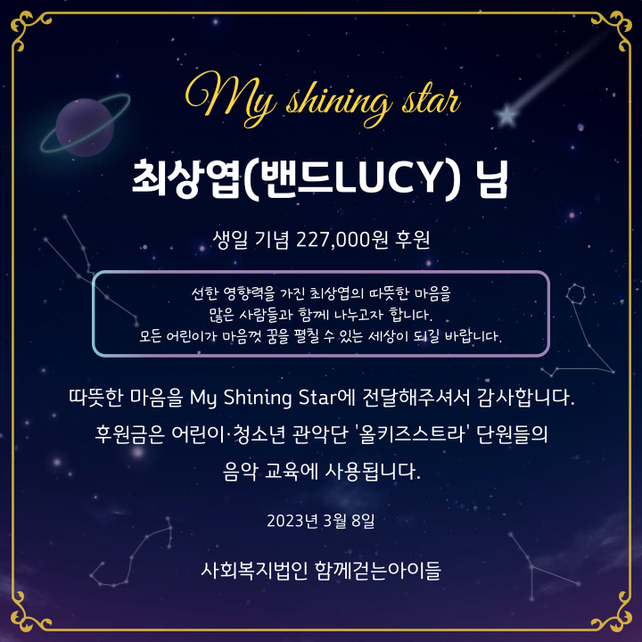 밴드 LUCY 최상엽 님의 팬분께서 최상엽 님의 생일(2월 27일)을 기념하여 후원해주셨습니다.