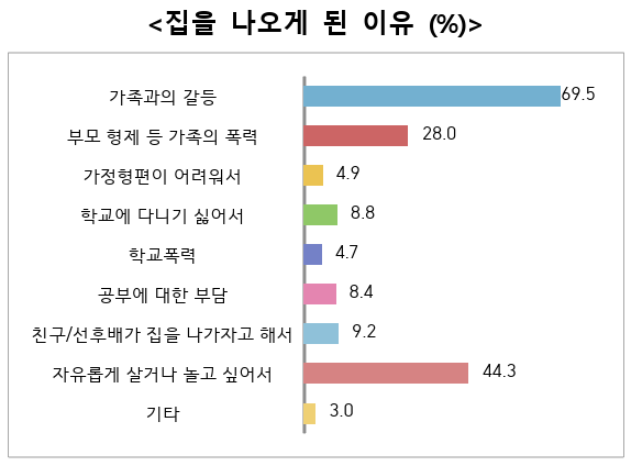 지난해 여성가족부에서 발표한 「위기 청소년 지원기관 이용자 생활실태조사」에 따르면, 탈가정 청소년들 가운데 69.5%는 ‘가족과의 갈등’, 28.0%는 ‘가족의 폭력을 피하기 위해’를 가출의 원인으로 꼽았다. 또한 지난해 청소년 쉼터 및 자립지원관을 이용한 청소년 중 72.1%는 가정에서 신체 폭력을, 72.9%는 언어폭력을 당했다고 답하는 등 지속적인 가정폭력에 노출된 것으로 나타났다. 따라서 청소년들의 탈가정에는 ‘생존형 가출’이 차지하는 비중이 높을 것으로 추정되며, 이는 학대 반복 가능성으로 인해 원가정으로의 복귀가 쉽지 않다는 것을 시사한다.