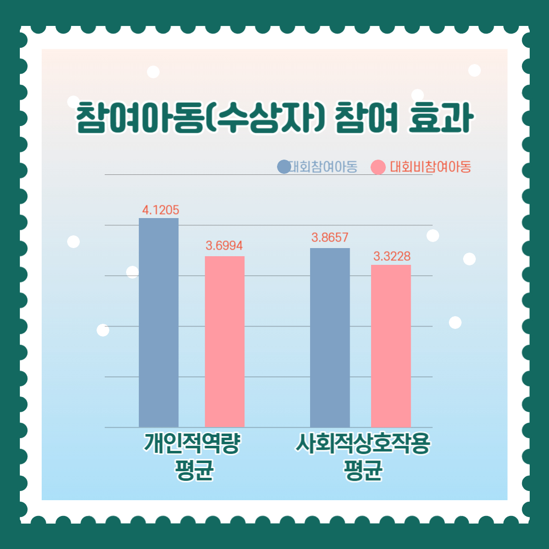 개인적 역량 평균, 사회적상호작용능력 평균을 보니 동시대회를 통해 성장한 어린이들의 변화가 느껴지네요!