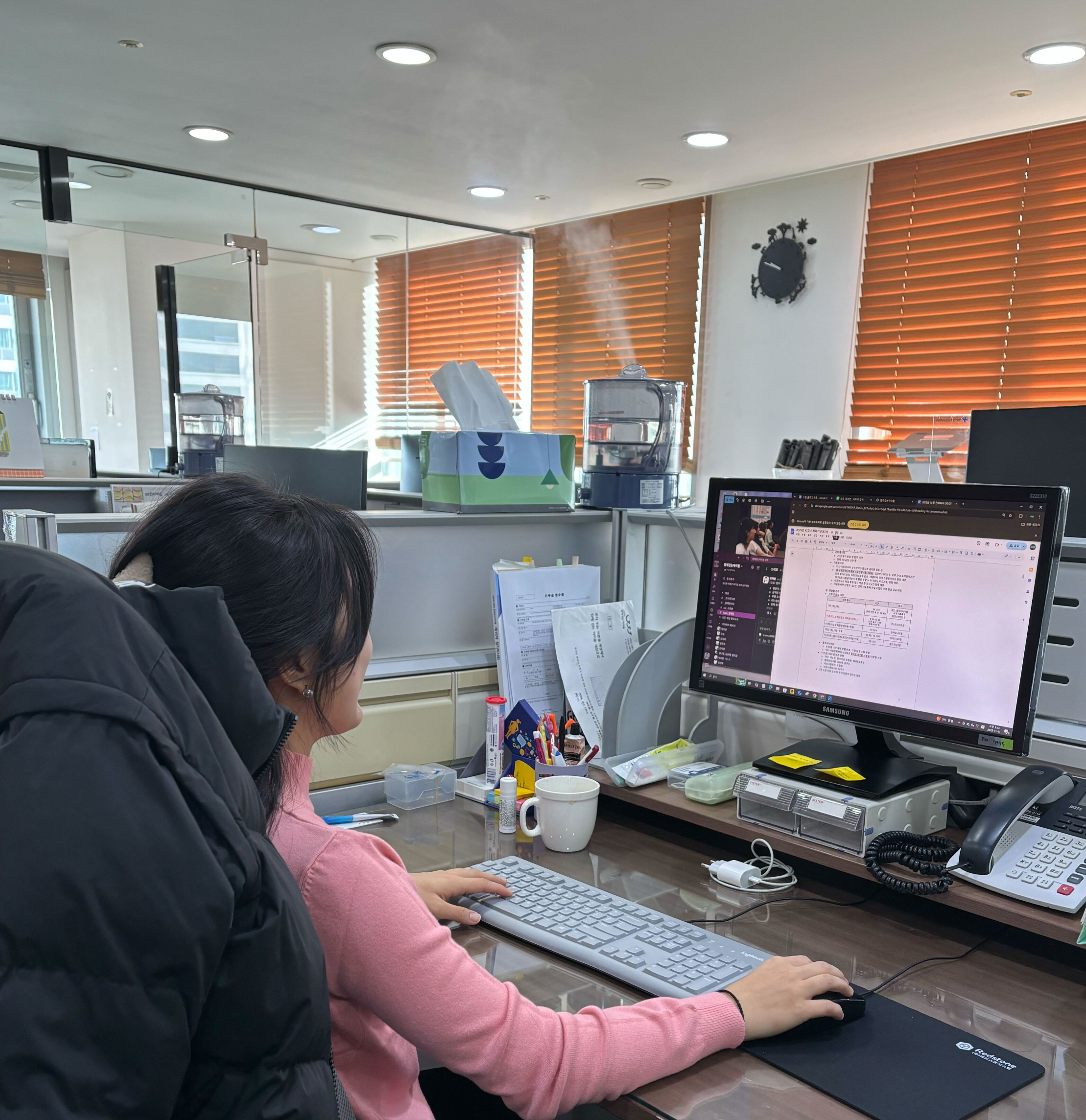 첫 책상 배정 후 팀장님께 인수인계를 받고 컴퓨터를 켰을 때, 내부 소통 시스템이 인상적이었습니다. 함께걷는아이들은 Slack과 구글 기반의 문서 공유를 활발히 활용해 원격회의와 협업이 원활했습니다. 특히 문서에 하이퍼링크를 걸어 관련 자료에 바로 접근하도록 한 방식이 효율적으로 느껴졌습니다. (그리고 소통을 할 때, 다양한 이모티콘을 사용하던 점이 재미있었습니다.)